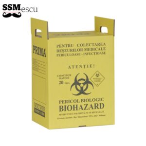 DescriereCutie Incinerare Deseuri Periculoase 20 LCutie paralelipipedica obtinuta din carton triplu, de culoare galbena destinat procesului de colectare, pastrare si depozitare a tuturor deseurilor periculoase si produselor contaminate din laboratoarele medicale/ cosmetice, in vederea distrugerii acestora si a mentinerii celui mai inalt grad de igiena si sterilitate din unitatile respective.Stratul interior este confectionat dintr-un carton…