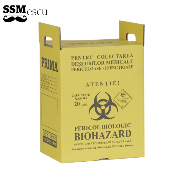 DescriereCutie Incinerare Deseuri Periculoase 20 LCutie paralelipipedica obtinuta din carton triplu, de culoare galbena destinat procesului de colectare, pastrare si depozitare a tuturor deseurilor periculoase si produselor contaminate din laboratoarele medicale/ cosmetice, in vederea distrugerii acestora si a mentinerii celui mai inalt grad de igiena si sterilitate din unitatile respective.