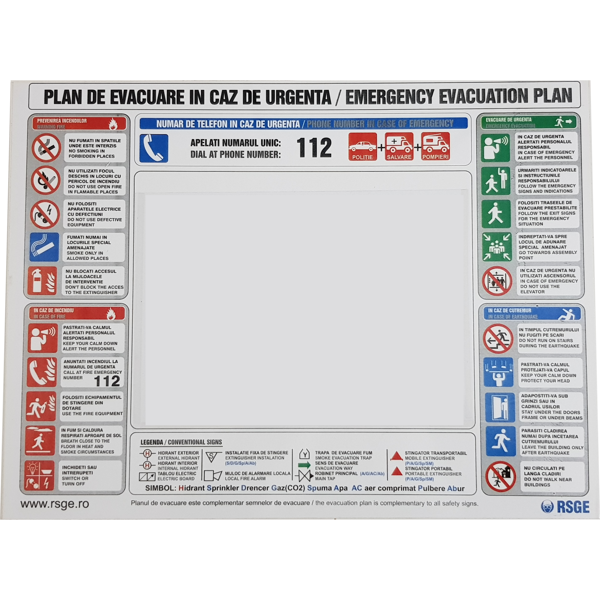 Produs 100% romanesc! SSMescu sustine productia romaneasca de Planuri de evacuare din PVC!Comandati acum planul de evacuare de pe SSMescu.ro!Pentru orice fel de informatii suplimentare ne puteti contacta prin e-mail sau telefonic iar echipa SSMescu va v-a pune la dispozitie, in timp util, toate amanuntele necesare.Regasiti la vanzare Planul de evacuare in pachetul full:Trusa Sanitara prim ajutor FIXAStingator cu pulbere tip P6Set 40 autocolante obligatorii firme-institutiiCos gunoi cu scrumiera circularPlan de evacuareSet autocolante PSISuport fixare stingator