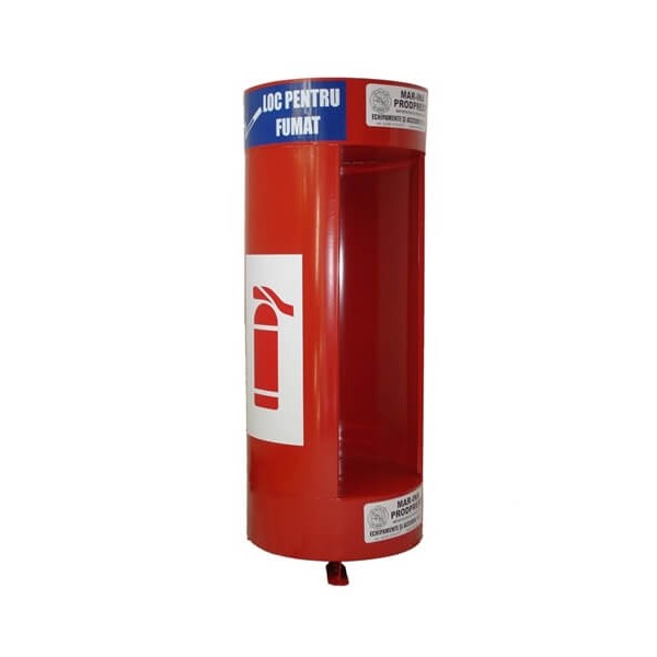 Suportul de stingator poate cu usurinta sa inglobeze atat un stingator P6 cat si un G2, G5 sau chiar SM6, a fost realizat special pentru a deservi personalului fumator si in acelasi timp vizitatorilor/ clientilor, fiind usor de intretinut de catre personalul de curatenie.Caracteristici Scrumiera metalica cu suport stingator: Material: tabla decapata OL 37 de 1 mm laminata la rece.Dimensiuni: Inaltime =750 mm; Diametru = 300 mm;Descriere: Constructie metalica rotunda cu diametru de 300 mm si 2 fante cu latimea de 170 mm. La partea superioara exista un spațiu pentru nisip în care se sting țigările. Prin fante se poate introduce un stingator P6. Fixarea pe podea se face cu ajutorul a trei suporti. Se vopseste in camp electrostatic, cu vopsea pulbere poliesterica RAL 3000.Destinatie: scrumiera și suport stingator P6, destinata spatiilor interioare și exterioare